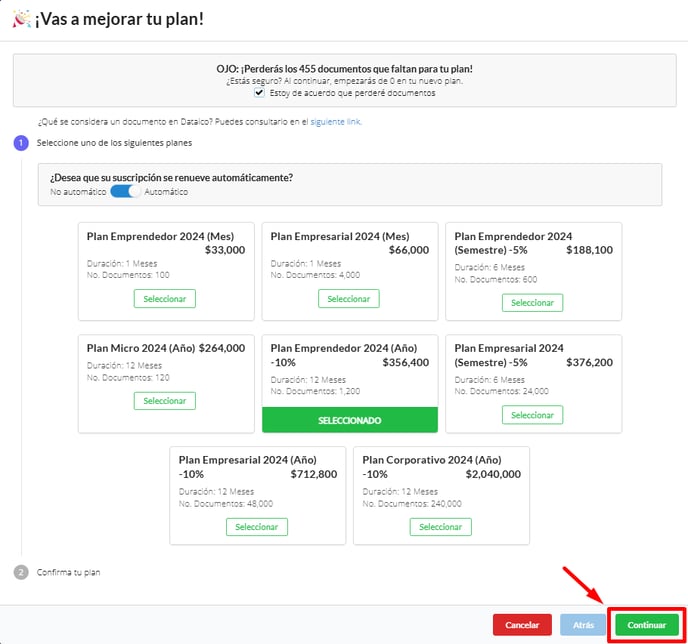 - Elige el plan que mejor se ajuste a tu negocio y haz clic en Continuar.
