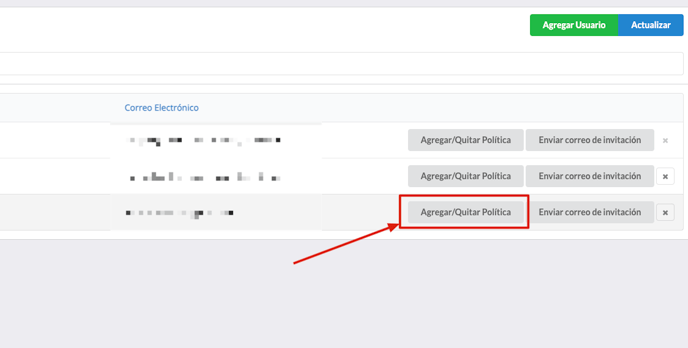 Ubica el usuario al que deseas editar y haz clic en Agregar/Quitar Política.