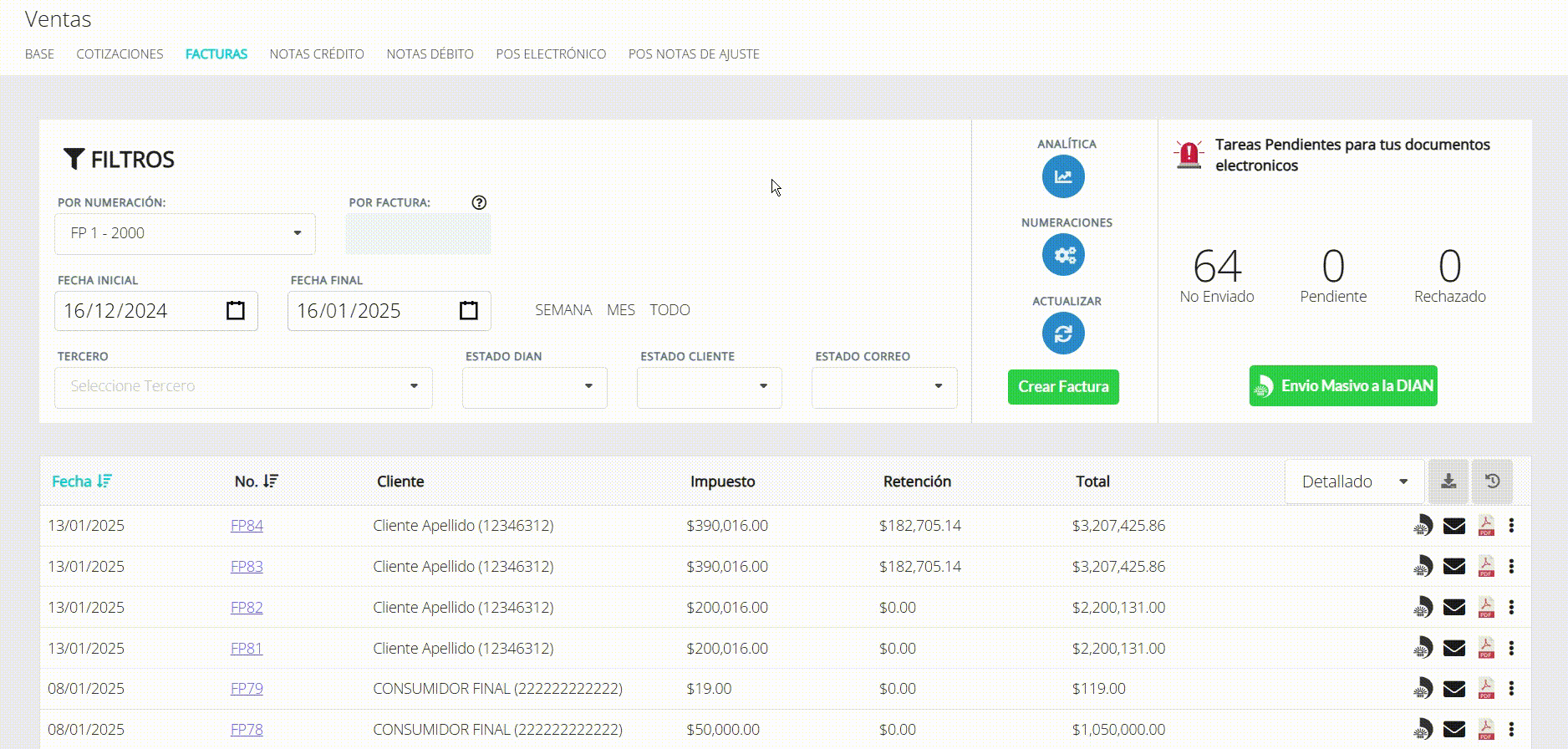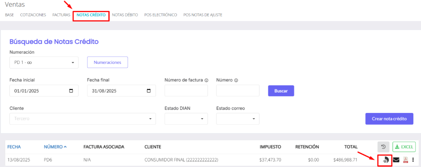 5. Se debe validar desde el submódulo de notas crédito, que la nota crédito generada esté enviada a la DIAN.