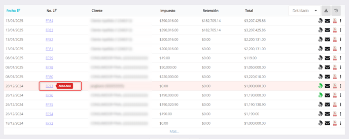 2. Busca en la lista la factura que deseas anular y haz clic en los tres puntos que aparecen a la derecha. > Elige la opción Anular factura.