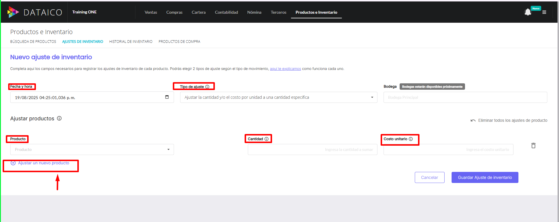 - En el campo producto: Selecciona el producto que deseas ajustar.