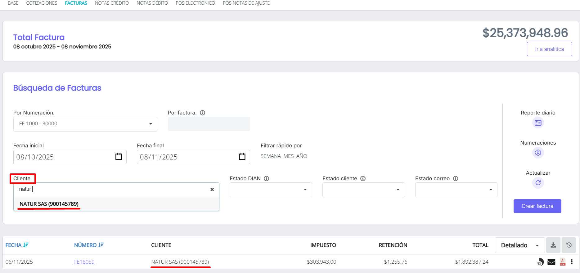 ☑️ De este modo, aparecerán todas las facturas asociadas al tercero de la búsqueda.