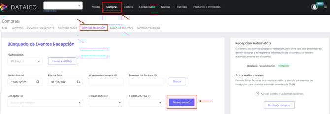 1. Ingresa al módulo Compras > Eventos de recepción, Luego haz clic en Nuevo evento.