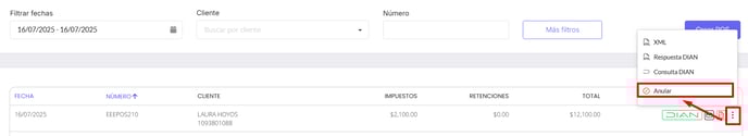 - En los tres puntos de la parte derecha de la factura, das clic en la opción anular.