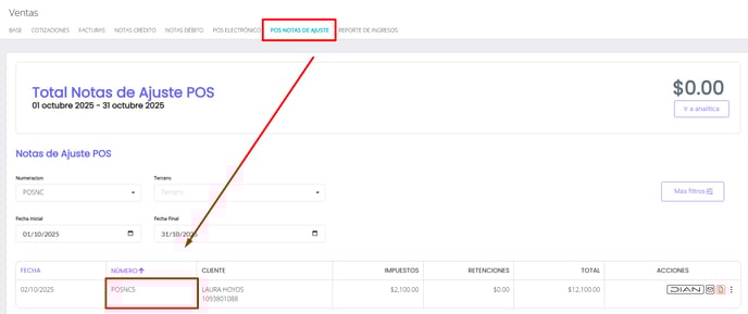 4. Una vez hayas dado clic en la opción anular, Dataico generará la nota de ajuste en la pestaña POS notas de ajuste donde podrás emitirla a la Dian.