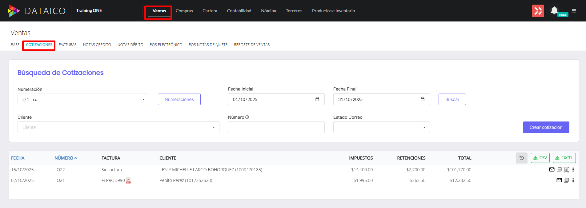 1. Ingresa al módulo de Ventas > Cotizaciones en el sistema.
