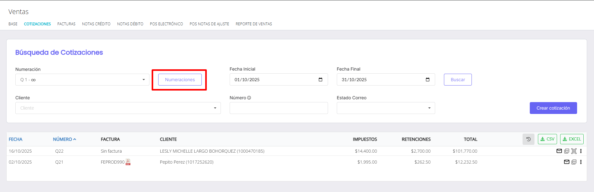 2. Haz clic en el ícono de la tuerca ubicado junto a la opción Numeraciones.
