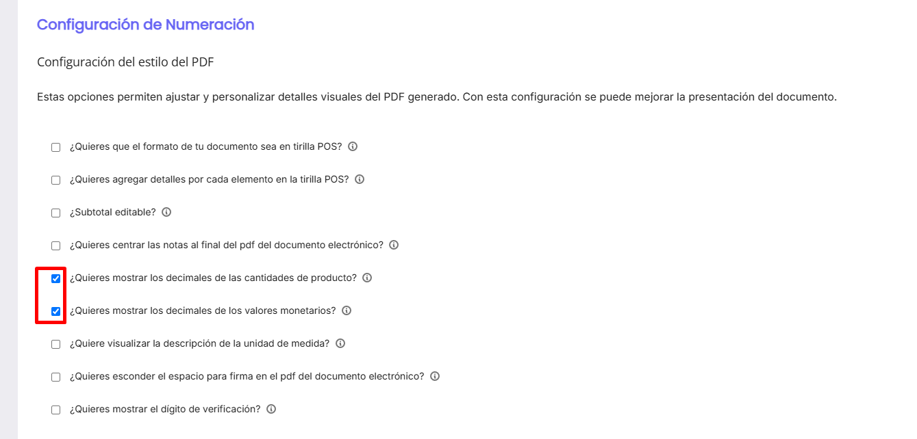 - ¿Quiere mostrar los decimales de los valores monetarios? Esta opción funciona para mostrar los decimales de los valores monetarios como precios unitarios, operaciones entre (precio x cantidad) e impuestos.