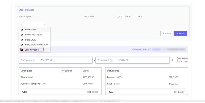 7. Una vez creado, el concepto aparecerá disponible cuando estés agregando “Otras novedades / Ingresos” durante la liquidación de nómina de un empleado.