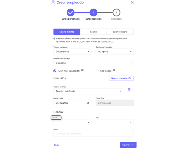 5. Una vez creada, la sede aparecerá disponible al crear o editar empleados, para que puedas asignarla fácilmente.