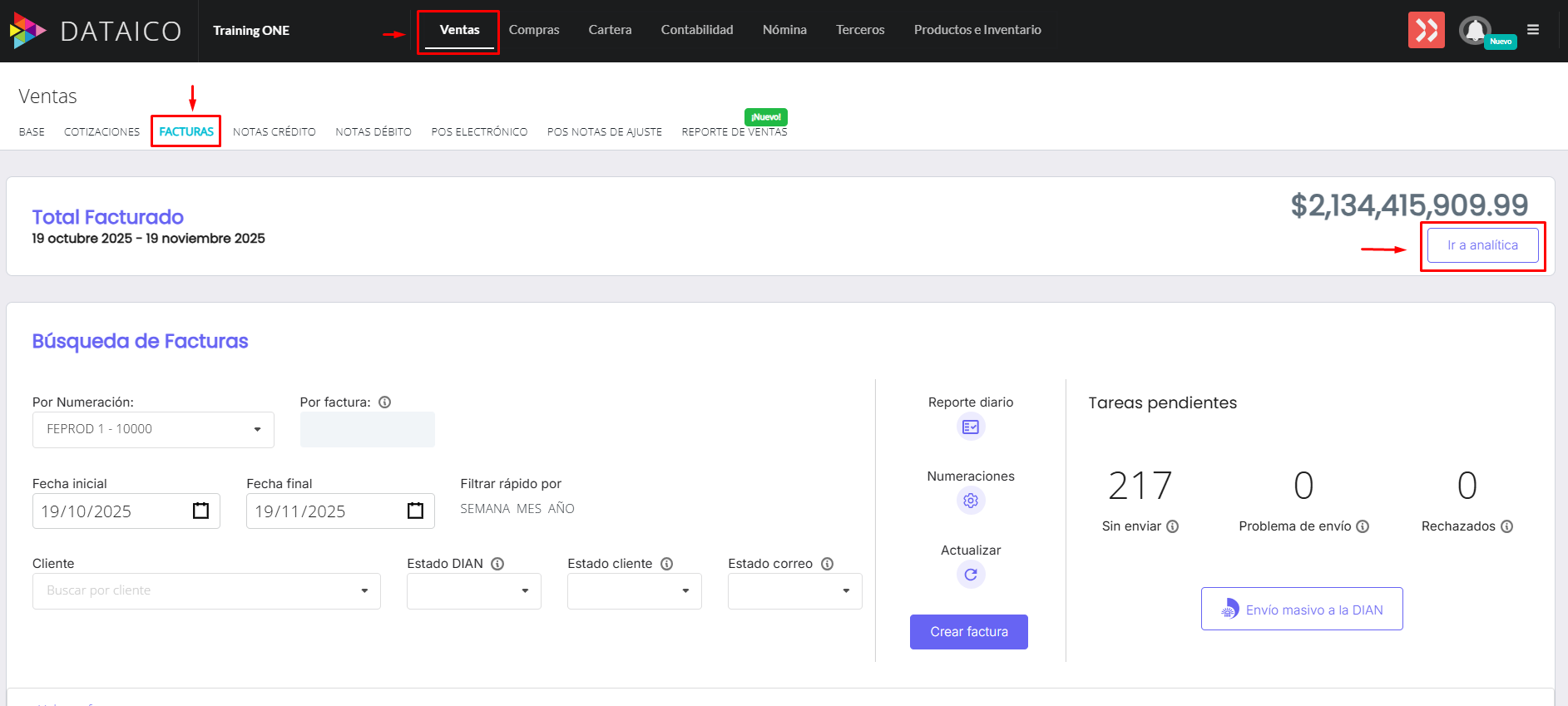 1. Ingresa al módulo de ventas, luego submódulo facturas, a mano derecha selecciona el botón que indica "Ir a Analítica."