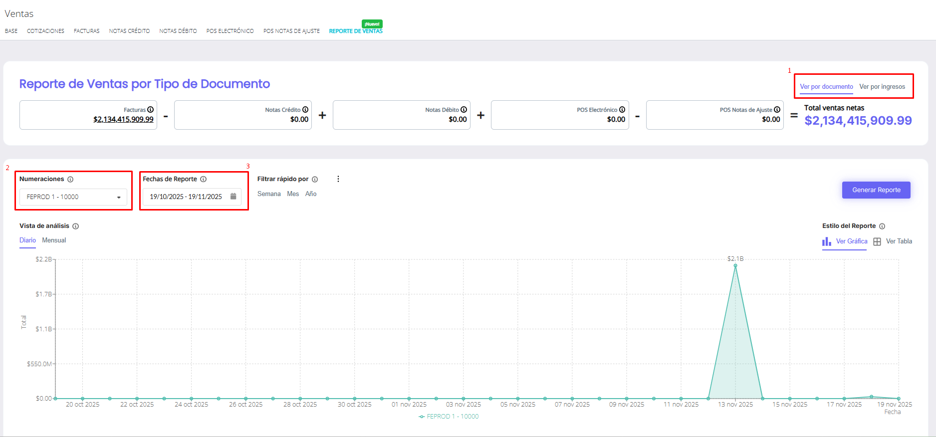 - Luego selecciona la resolución, esto permite filtrar las ventas por un prefijo de numeración