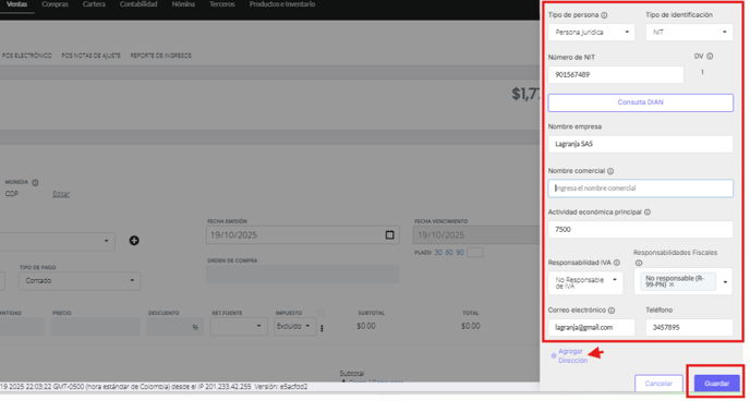 • Si el cliente (tercero) ya está registrado, escribe su nombre, y la plataforma llenará los campos automáticamente.