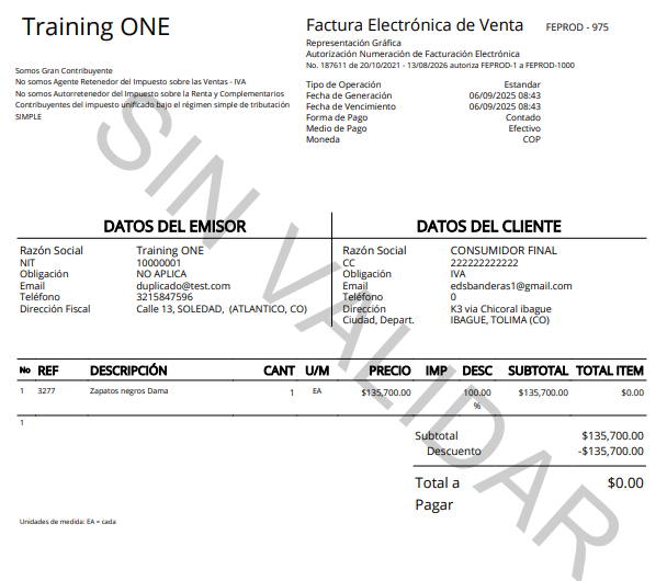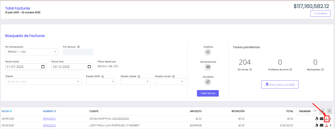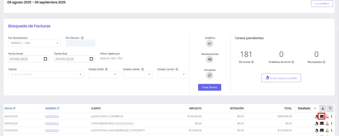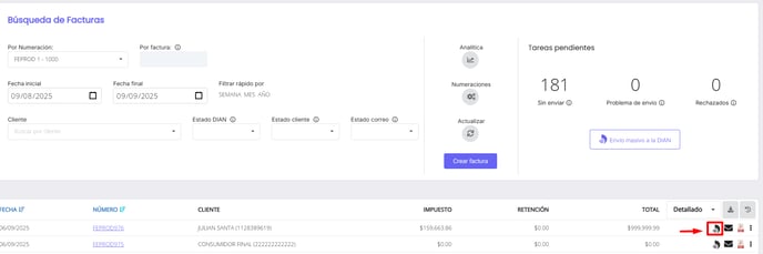 • 2. Una vez enviada la factura a la Dian, puedes enviar la factura a tu cliente, haz clic en el icono de sobre. Cambiará de negro a verde, indicando que se envió correctamente.