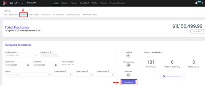 1. Ingresa a Ventas > Facturas, elige la numeración de facturación electrónica y haz clic en el botón Crear factura.