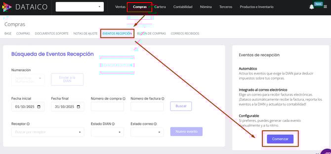 1. Ingresa a Compras > eventos de recepción > Das clic en Comenzar.