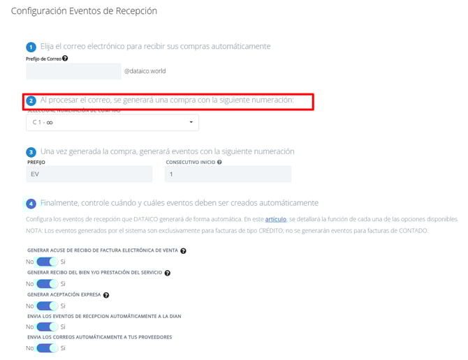 Establece el consecutivo con el que comenzará la numeración donde se generarán las compras provenientes de las facturas de tus proveedores.