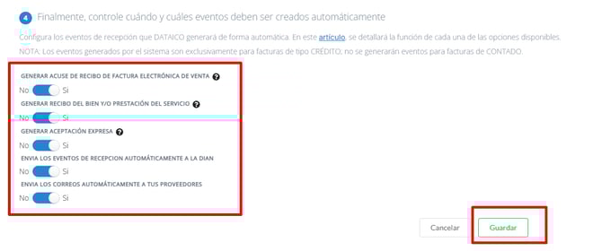 5. Activa los eventos que deseas que el sistema realice automáticamente por ti, arrastrando el ícono de selección a SI.