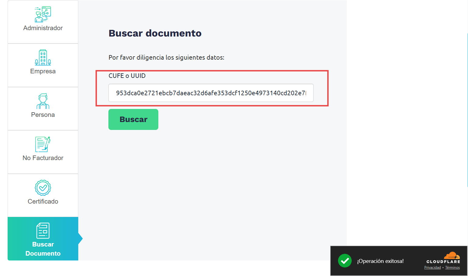 3. Pega el CUFE en la casilla de búsqueda y da clic en Buscar.