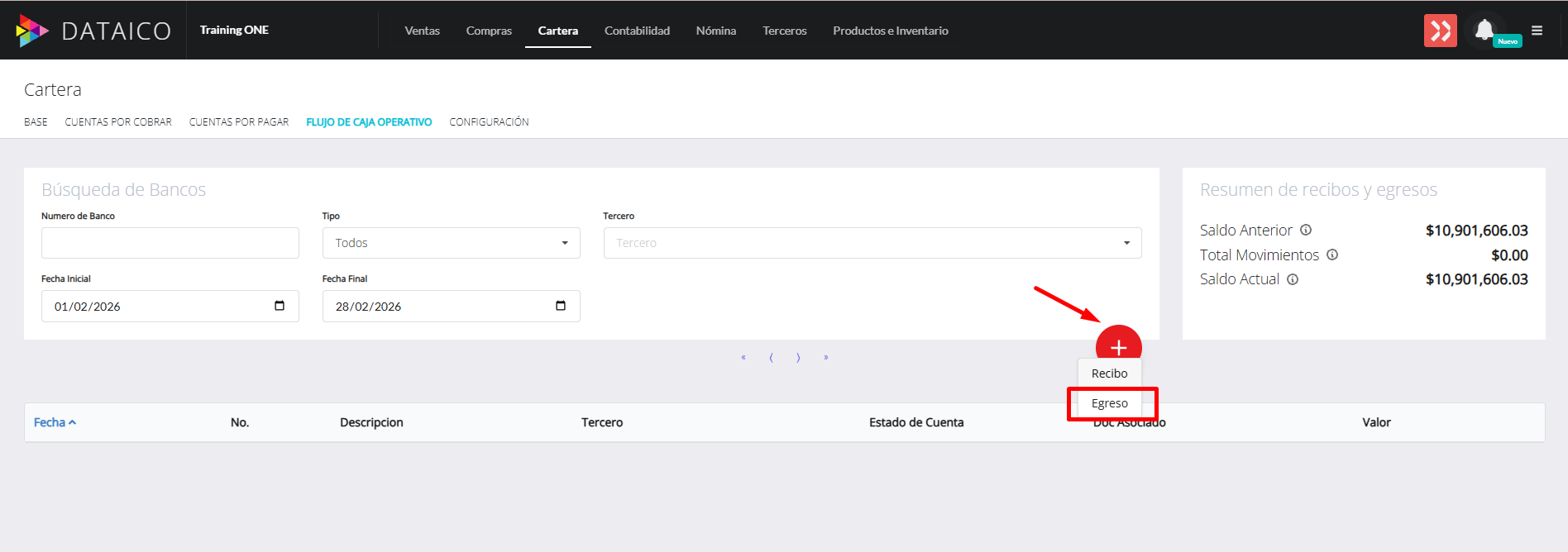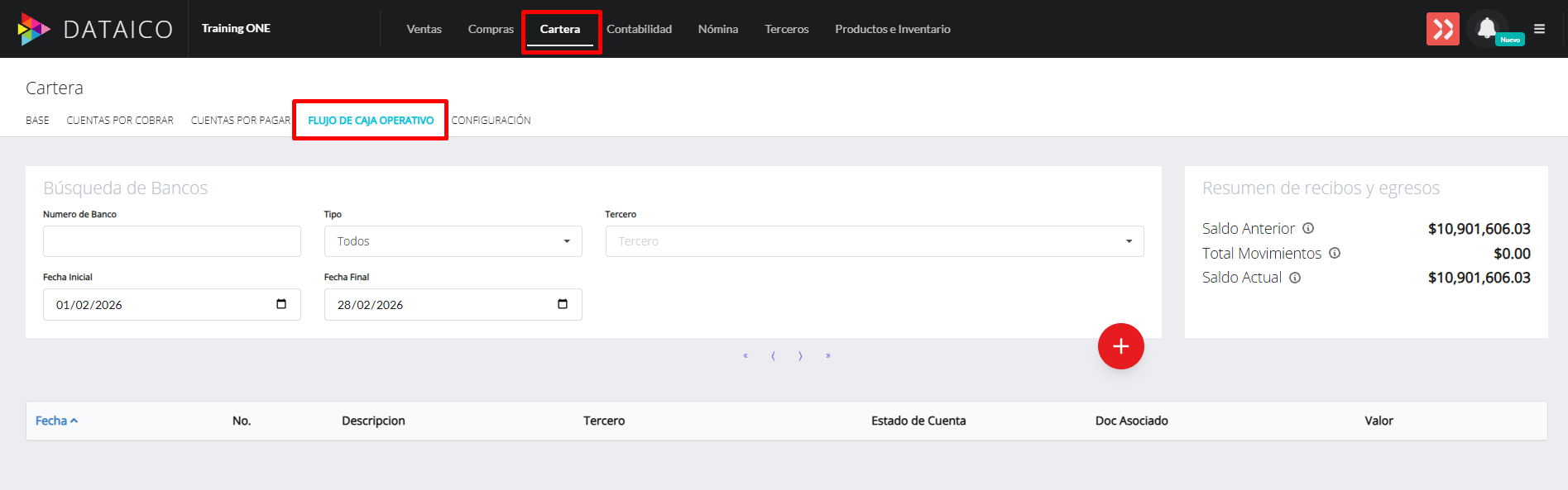 1. Debes ingresar al módulo de Cartera y seleccionas la pestaña "Flujo de caja operativo".