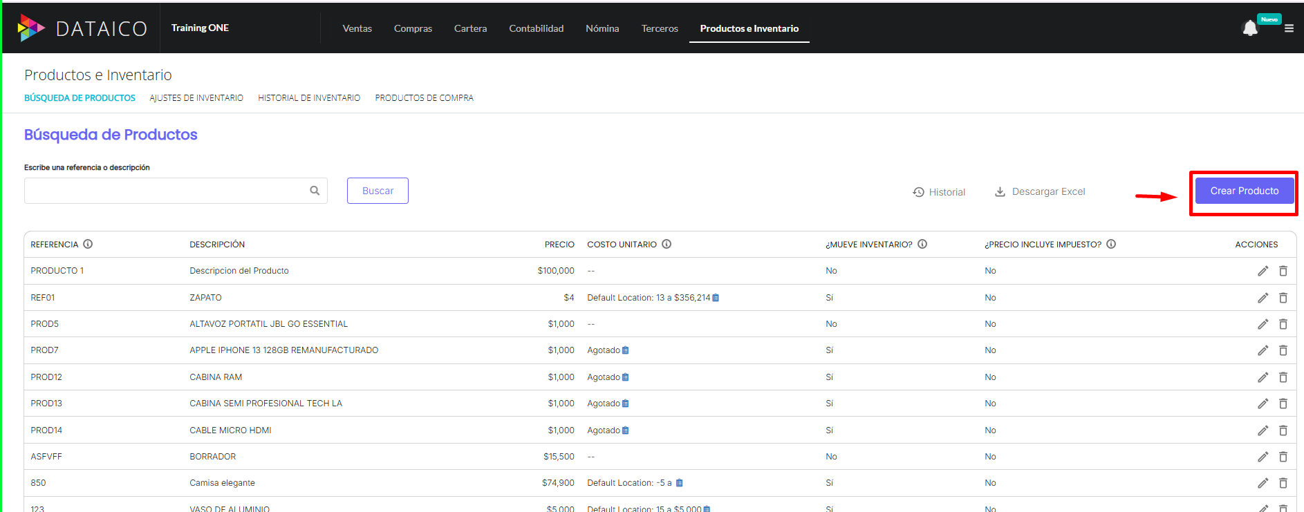 2. Haz clic en el botón Crear producto en la esquina superior derecha de la pantalla para añadir un nuevo producto.