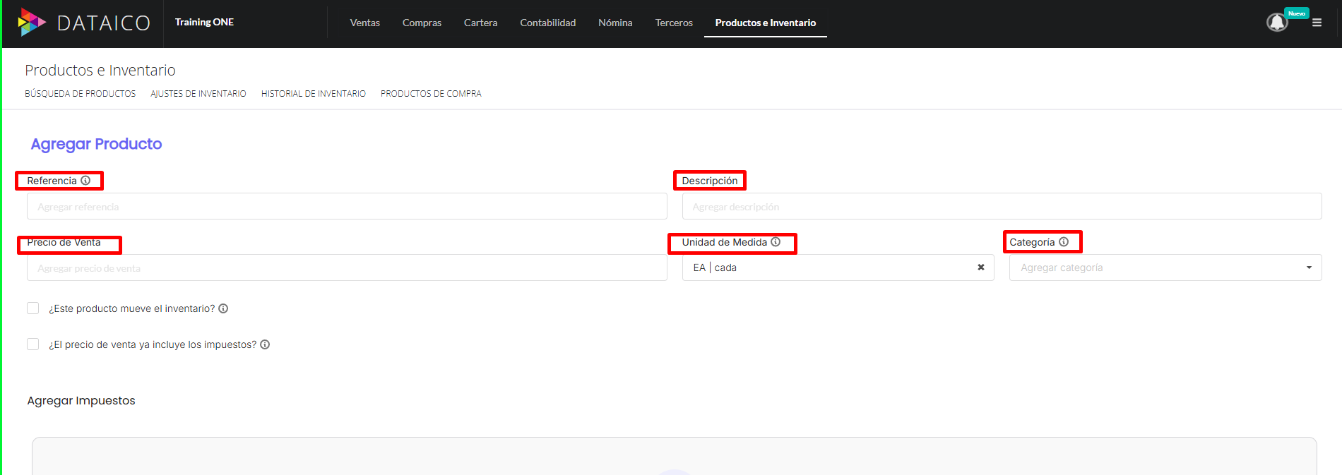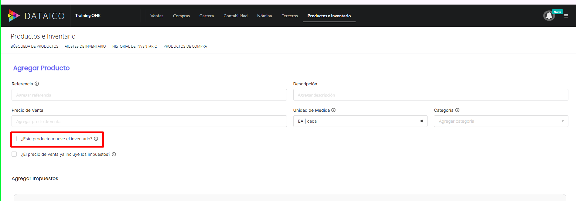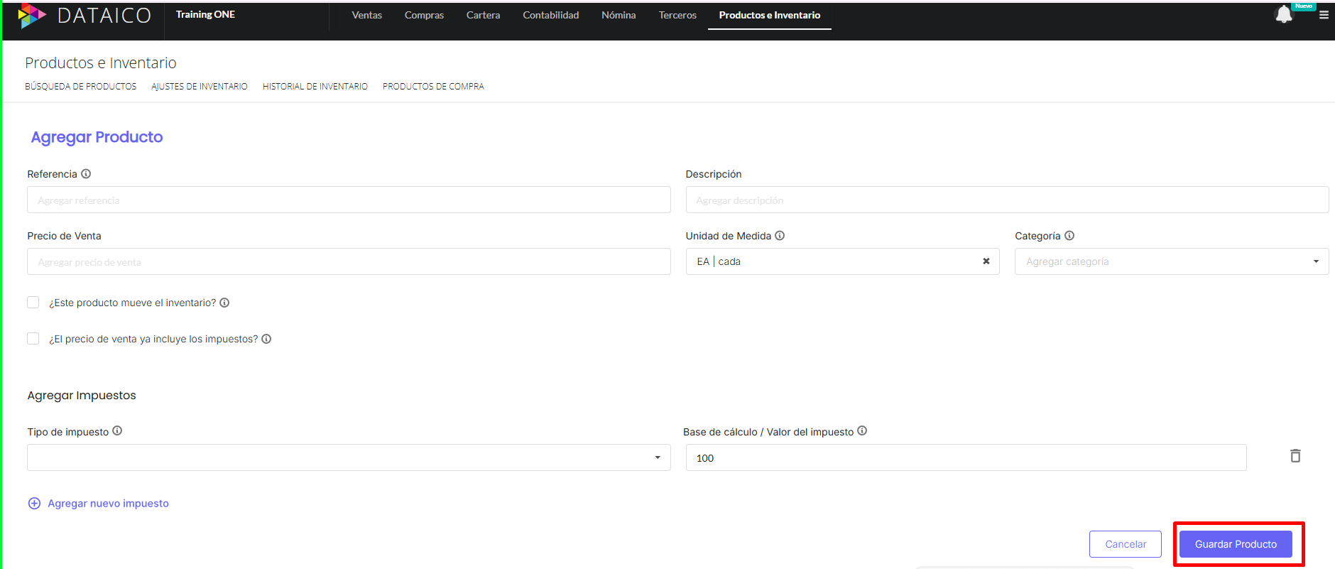 6. En la opción "Impuestos", haz clic agregar nuevo impuesto para agregar el tipo de impuesto que aplica al producto.