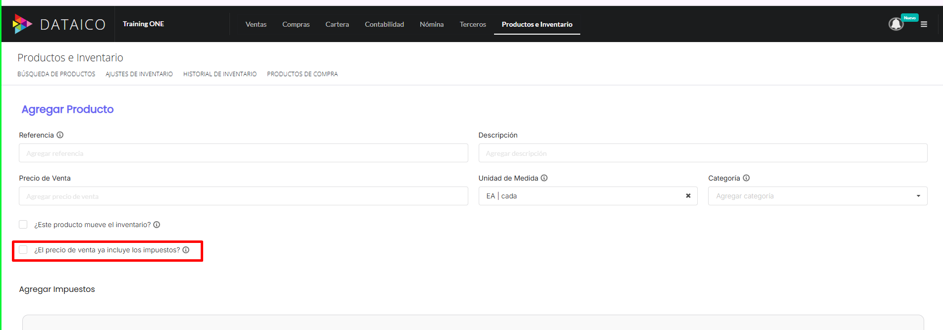 - Si el producto incluye IVA, selecciona el impuesto correspondiente.