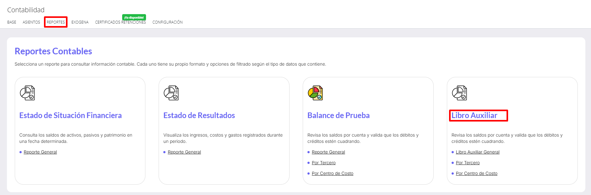 1. Ingresa al módulo de Contabilidad, seleccionas la pestaña "Reportes" y das clic en "Libro Auxiliar"