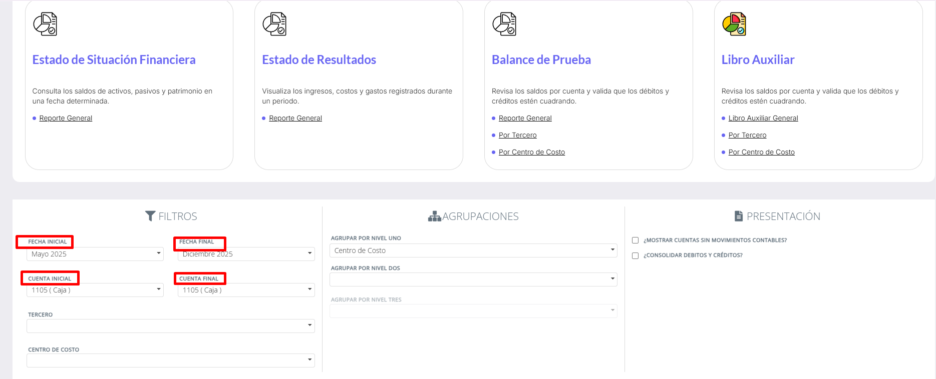 Para generar un informe auxiliar o de movimientos detallados sigue estos pasos: