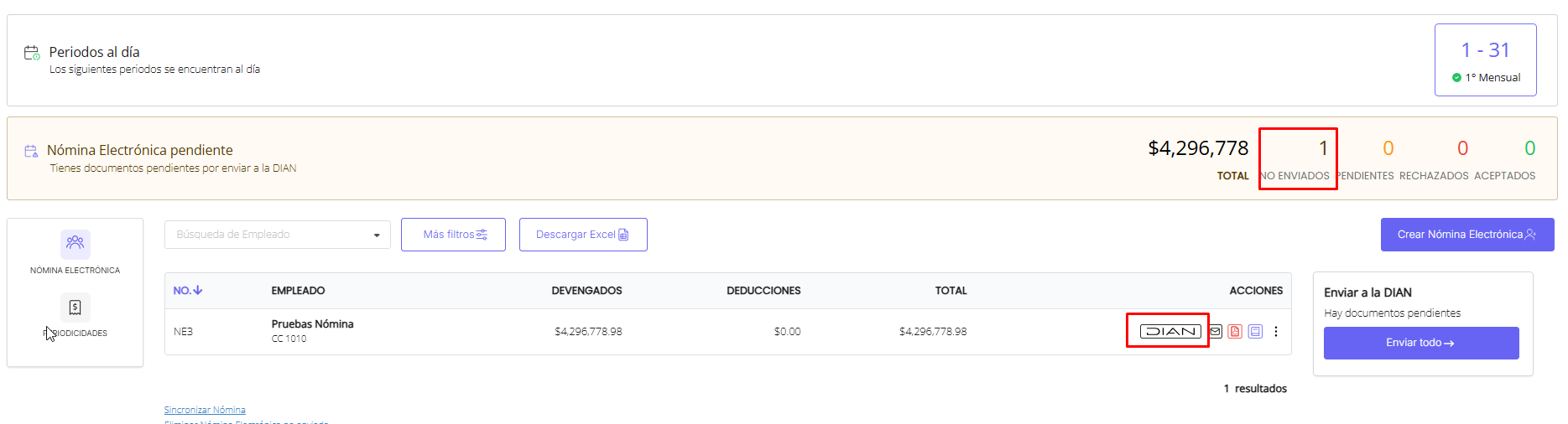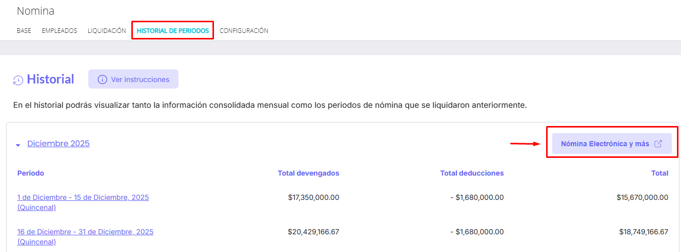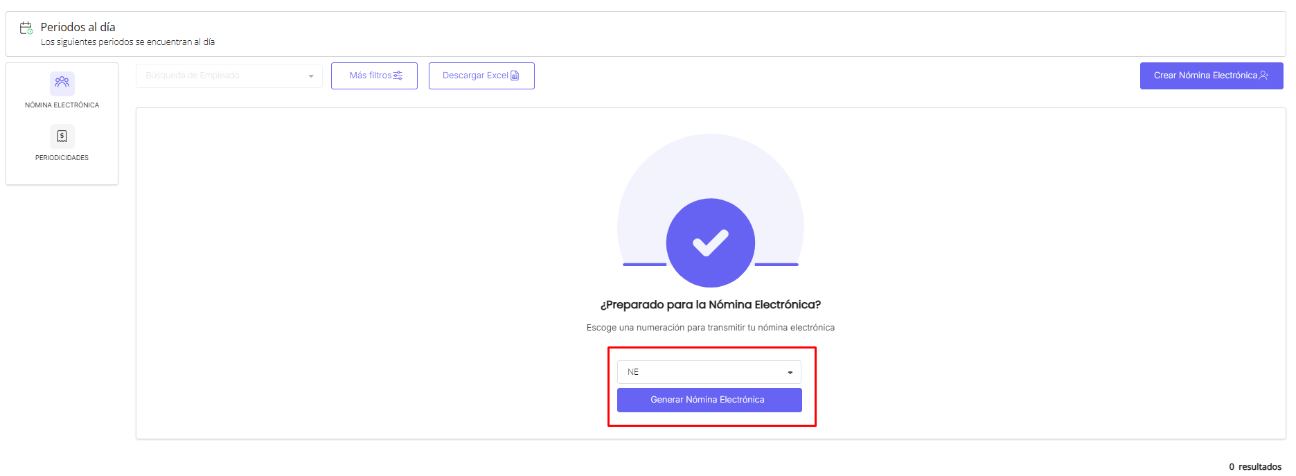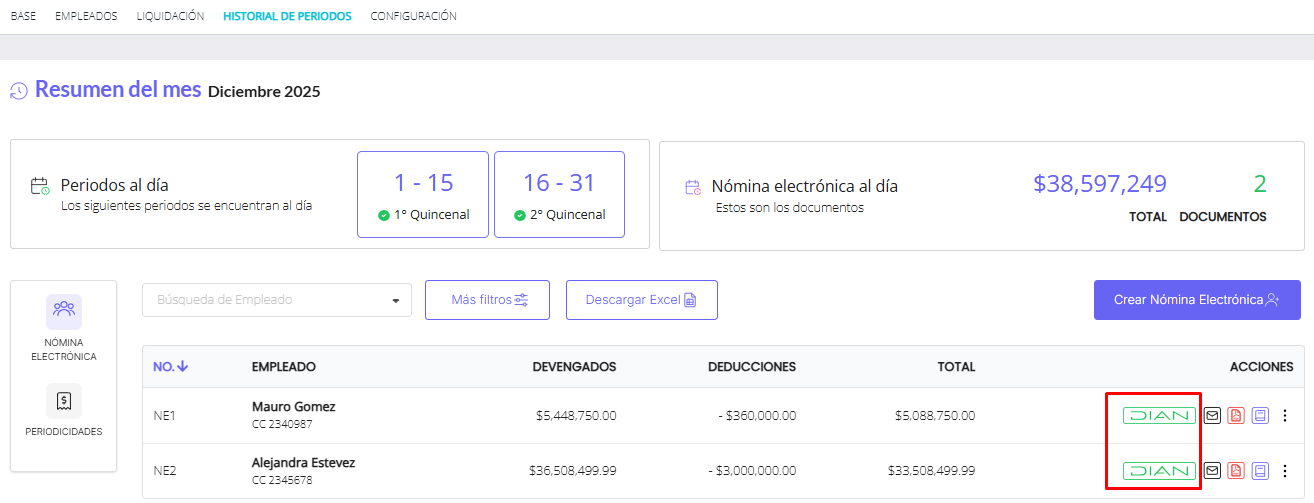 11. Para generar la Nómina electrónica debes tener liquidado los dos periodos del mes. Por ejemplo: si la periodicidad de pago de la empresa es quincenal, debes tener completado la Quincena 1 y la Quincena 2.