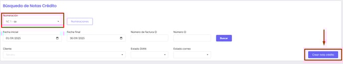 2. Seleccionas numeración y das clic en crear nota crédito.