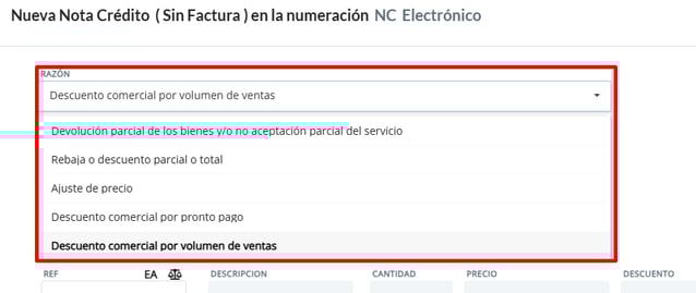 4. Le da clic en crear nota crédito.5. Eliges la razón de la nota crédito, debes elegir entre: