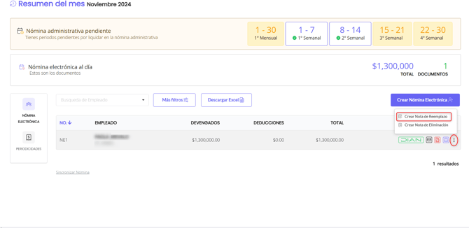 3. Una vez abierto el periodo de nómina, selecciona frente al trabajador los tres puntos, donde aparecerá la opción "Crear Nota de reemplazo".