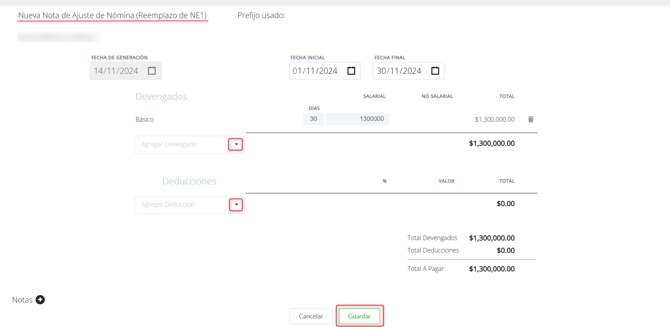 4. En el formulario de la Nota de Reemplazo de nómina podrás hacer los ajustes a la nomina electrónica que ya se envio > Luego, clic en Guardar.