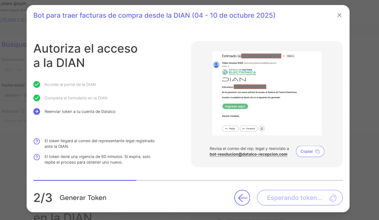 Desde el portal de la DIAN, genera el token de acceso y reenvíalo al correo bot-resolucion@dataico-recepcion.com.