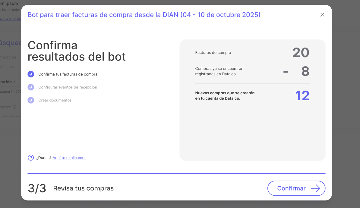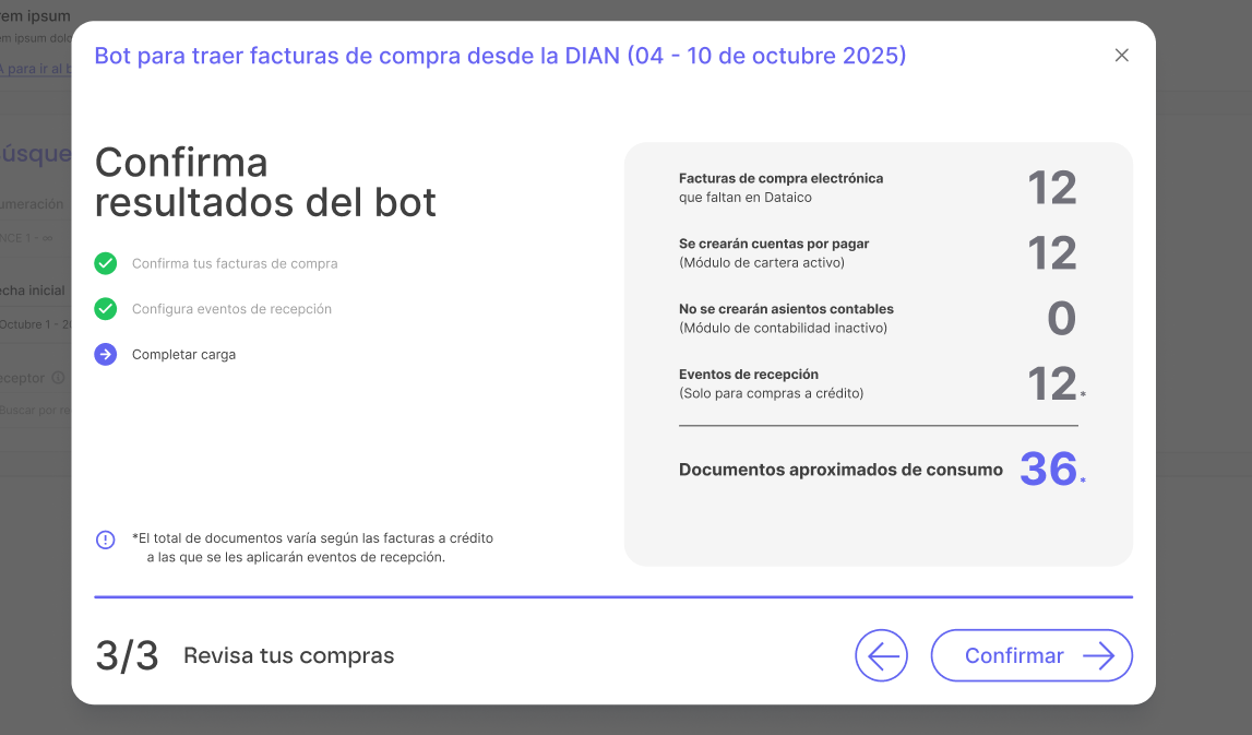 En este paso se resumen los resultados del proceso antes de crear los documentos:- Compras encontradas: Se indica cuántas facturas se detectaron y cuántas ya estaban en Dataico.