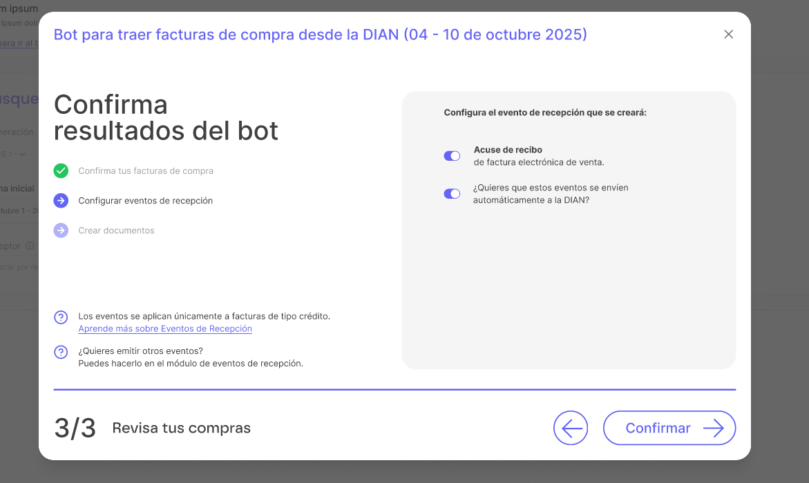 - Eventos de recepción: Es posible activar automáticamente el evento de acuse de recibo para las compras a crédito.