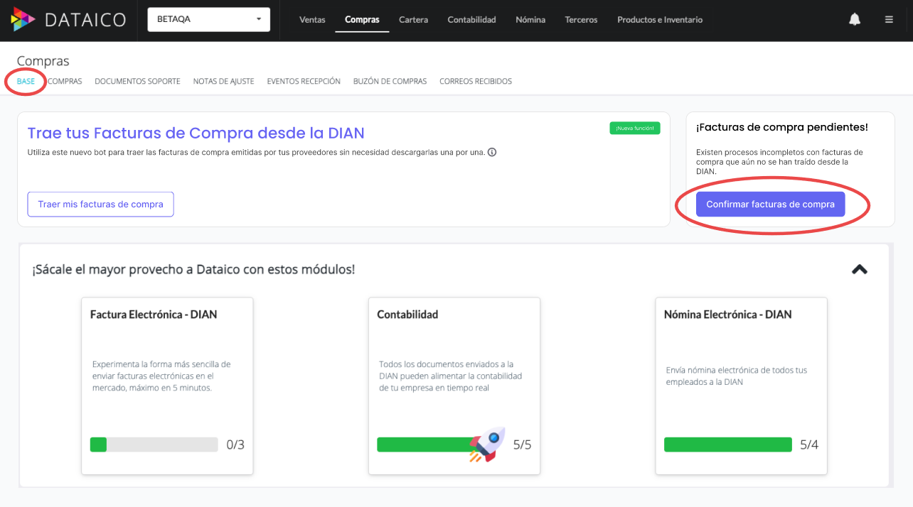 - Aparecerá una tarjeta informativa indicando que hay facturas de compra pendientes. Haz clic en el botón "Confirmar facturas de compra".