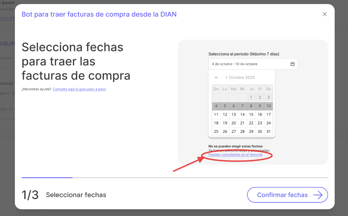 - Al ingresar nuevamente al proceso para traer facturas desde la DIAN, en el texto descriptivo aparece un enlace que lleva al dashboard de historial.