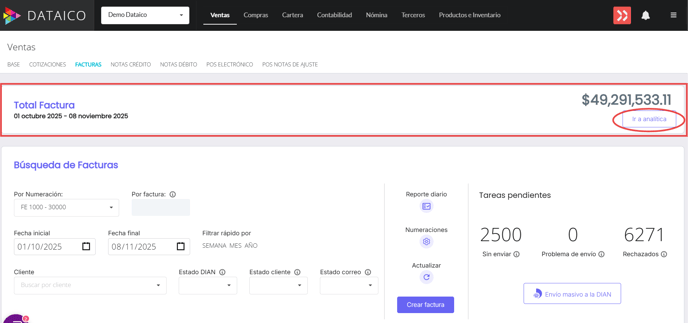 Desde el módulo Ventas > Facturas, se muestra un recuadro con el valor total facturado según el rango seleccionado. Allí está disponible el botón “Ir a analítica”, que redirige directamente al reporte de ventas.