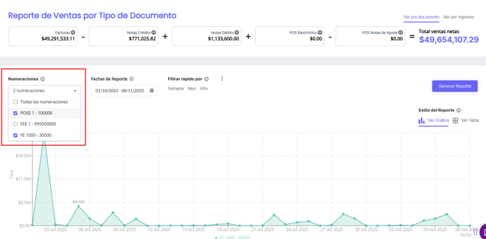 Es posible visualizar una o varias numeraciones a la vez. Esta opción permite comparar diferentes rangos o series de facturación según lo requerido.