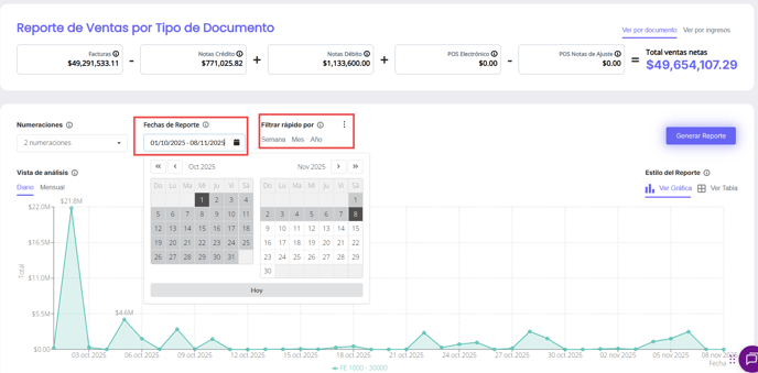 El reporte permite establecer un período personalizado o utilizar filtros rápidos (semana, mes, año) para facilitar la exploración temporal.