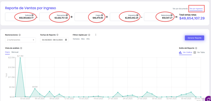 Por ingreso: subtotales, descuentos, impuestos, cargos y retenciones.