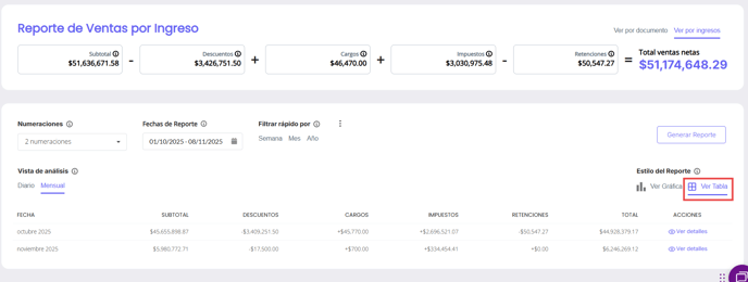 Por ingreso: muestra el detalle de subtotal, descuentos, cargos, impuestos y retenciones.