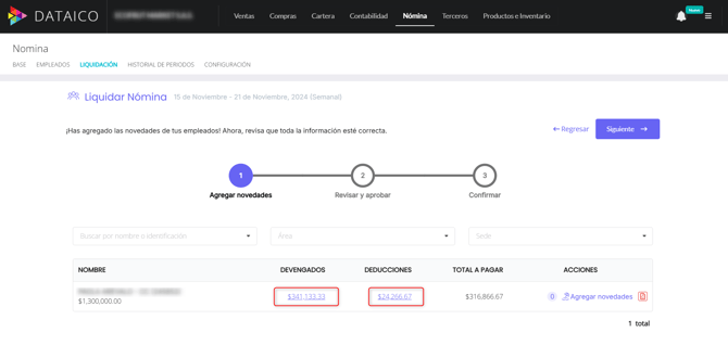 3. Cuando termine de cargar la información, vas a seleccionar el empleado que deseas revisa y para empezar a ver los cálculos puedes dar clic en el valor resaltado para el devengado o la deducción