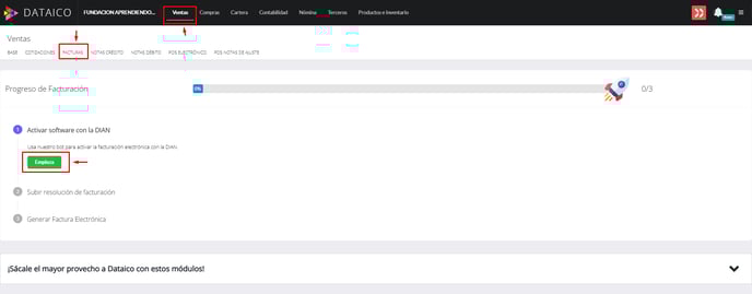 1. Para activar la facturación electrónica en Dataico con la plataforma de la DIAN debes dirigirte al módulo Ventas > Facturas > Activar Software y darás clic en "Empezar".