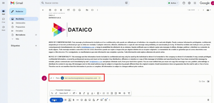 4. Reenviar el token a Dataico: El Bot de Dataico establecerá la conexión de tu cuenta con los sistemas de DIAN sin que tengas que hacer procesos manuales, para que esto sea posible solo debes reenviar el token de la DIAN al siguiente correo bot-resolucion@dataico-recepcion.com