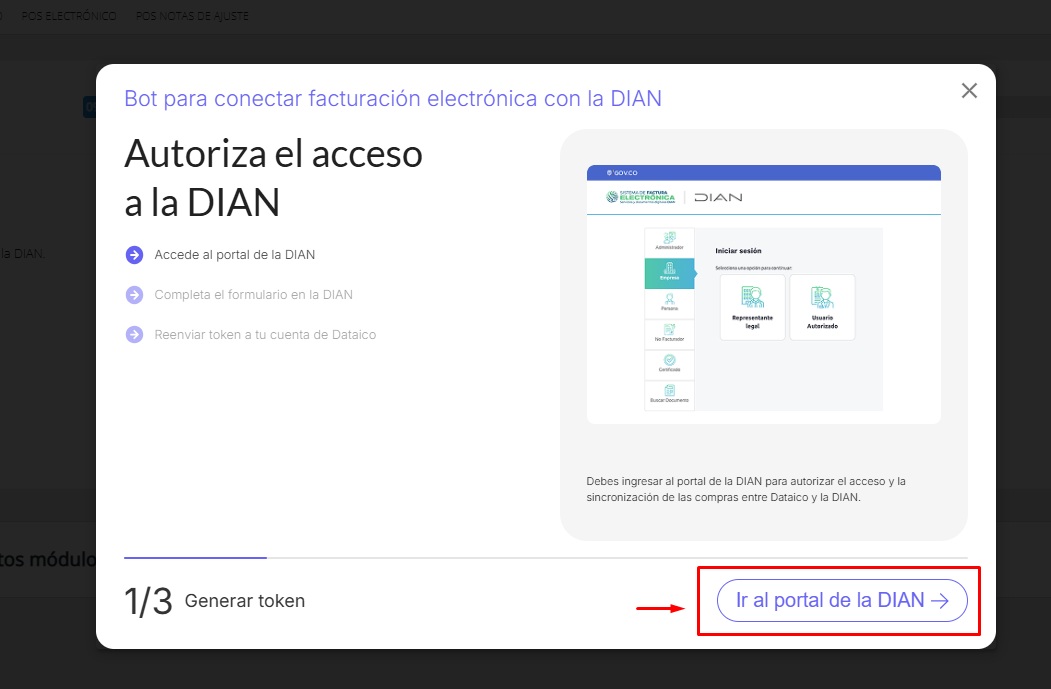 2. A continuación deberás autorizar el acceso a la DIAN, para esto selecciona la opción "ir al portal de la DIAN"